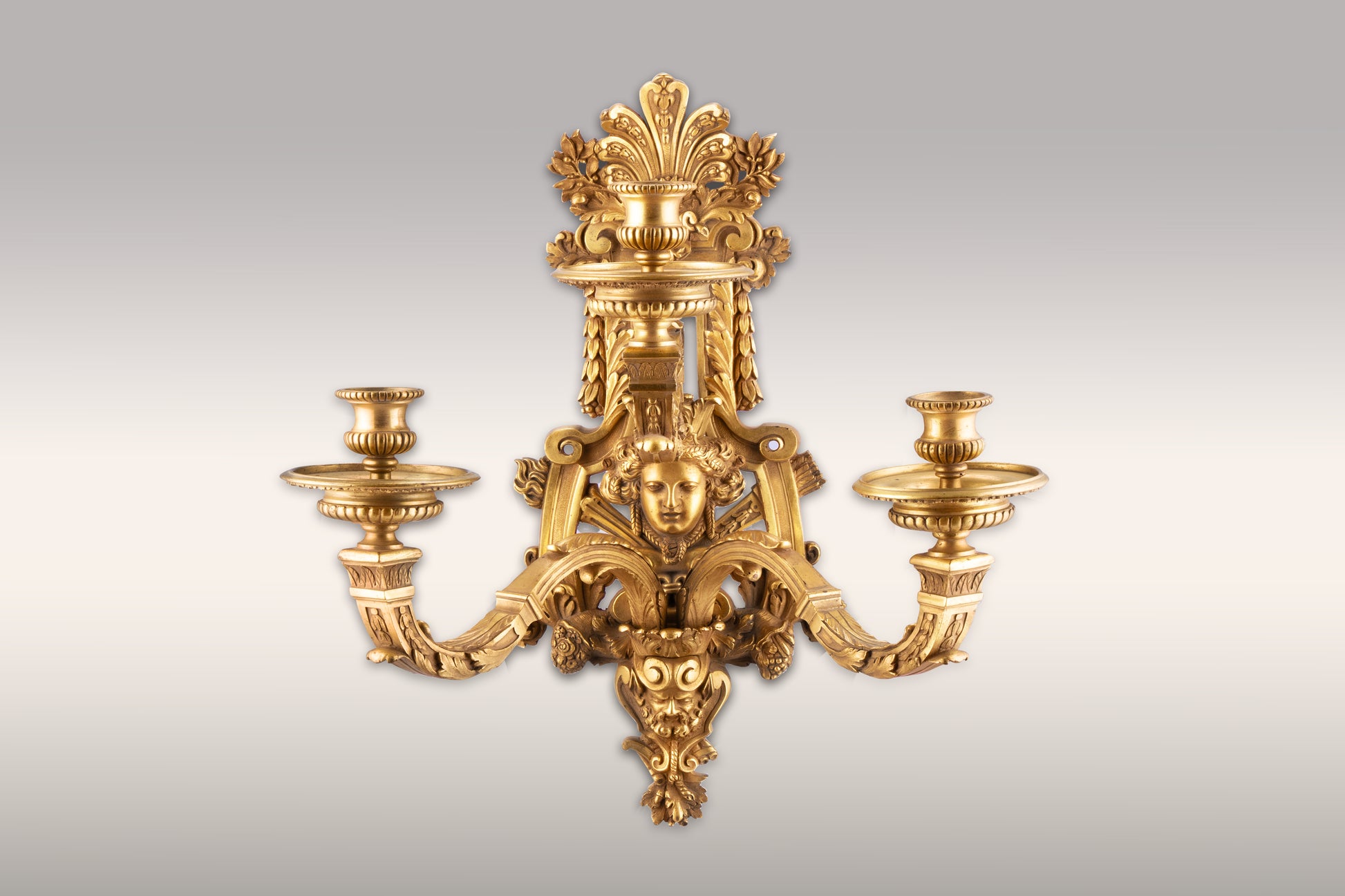 - Female Mask: The central female mask is a common feature in neoclassical design, often representing a goddess or allegorical figure. & Rossette.