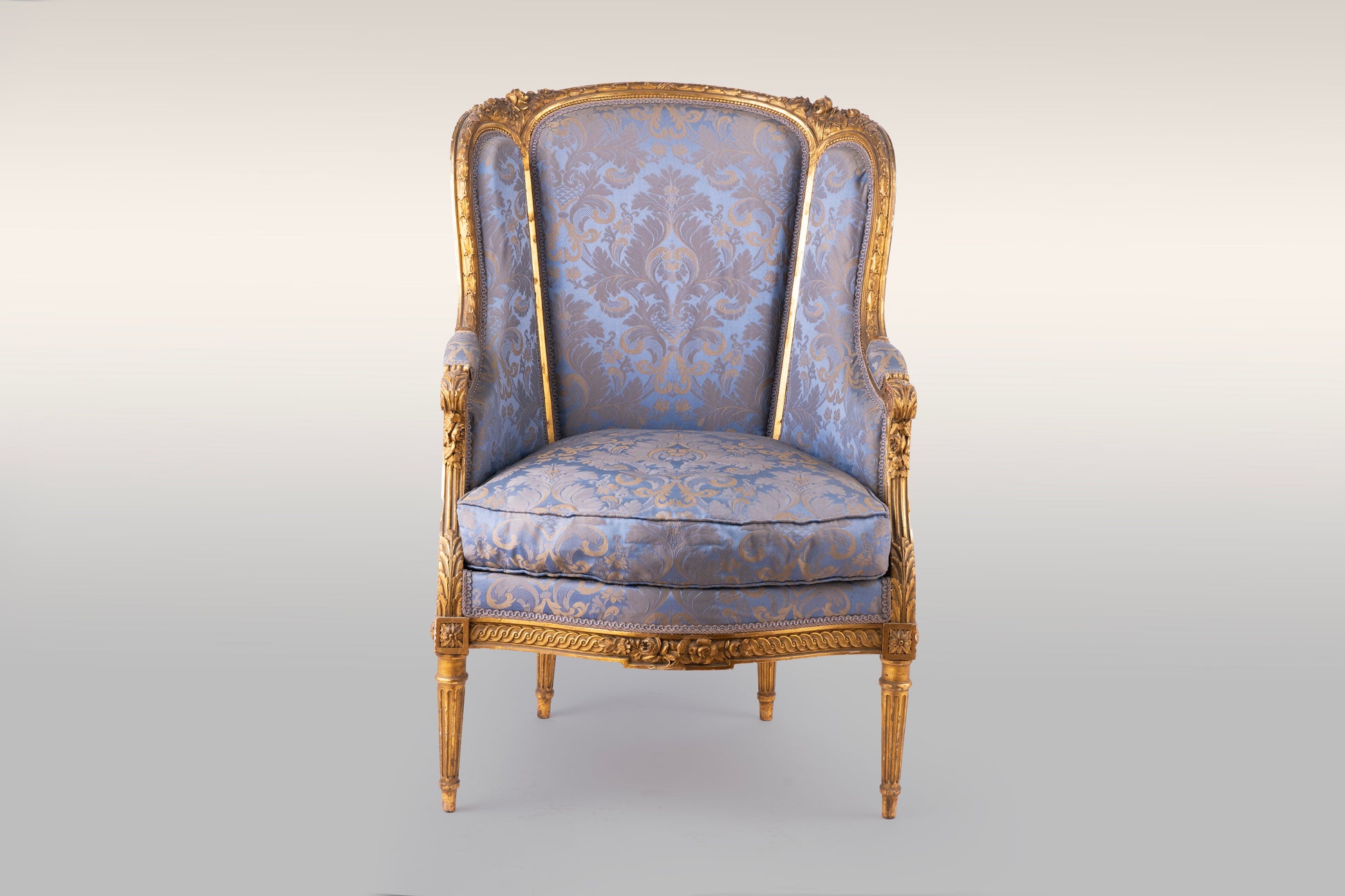 Material: Giltwood (carved wood with gold leaf), Upholstery (silk blue damask)